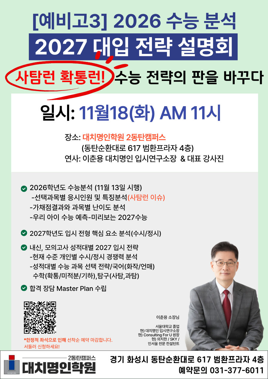 [11월18일]예비고3 2026수능완전분석 &2027대입 전략 설명회 사탐런! 입시판이 바뀐다!